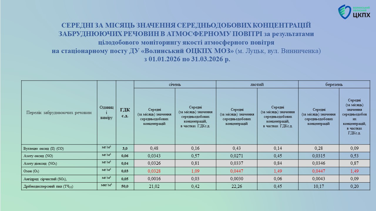 Спостереження за станом атмосферного повітря у Волинській області у І кварталі 2026р.