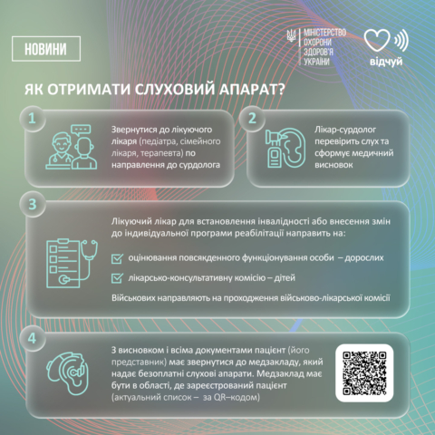 Крім того, МОЗ разом із ГО «Відчуй», розробили зручний путівник, у якому покроково описано, як отримати слуховий апарат. Більше інформації – за посиланням .