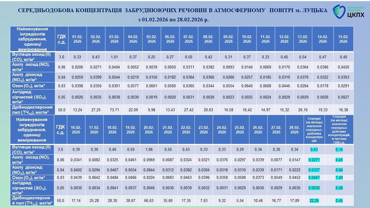 Середні значення концентрацій забруднюючих речовин за лютий перевищували ГДК лише по озону. Це відбулося через поєднання забруднювачів (викиди від опалення твердим паливом, роботу генераторів) з температурною інверсією.