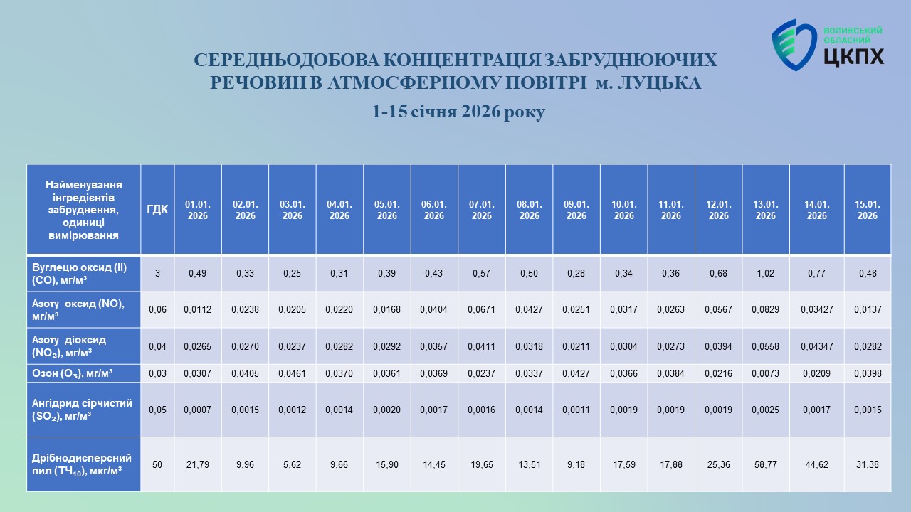 За період з 01.01.2026 по 15.01.2026 року отримані концентрації оксиду та діоксиду азоту, сірчистого ангідриду, вуглецю оксиду, озону, дрібнодисперсного пилу (ТЧ10) наведені в таблиці.