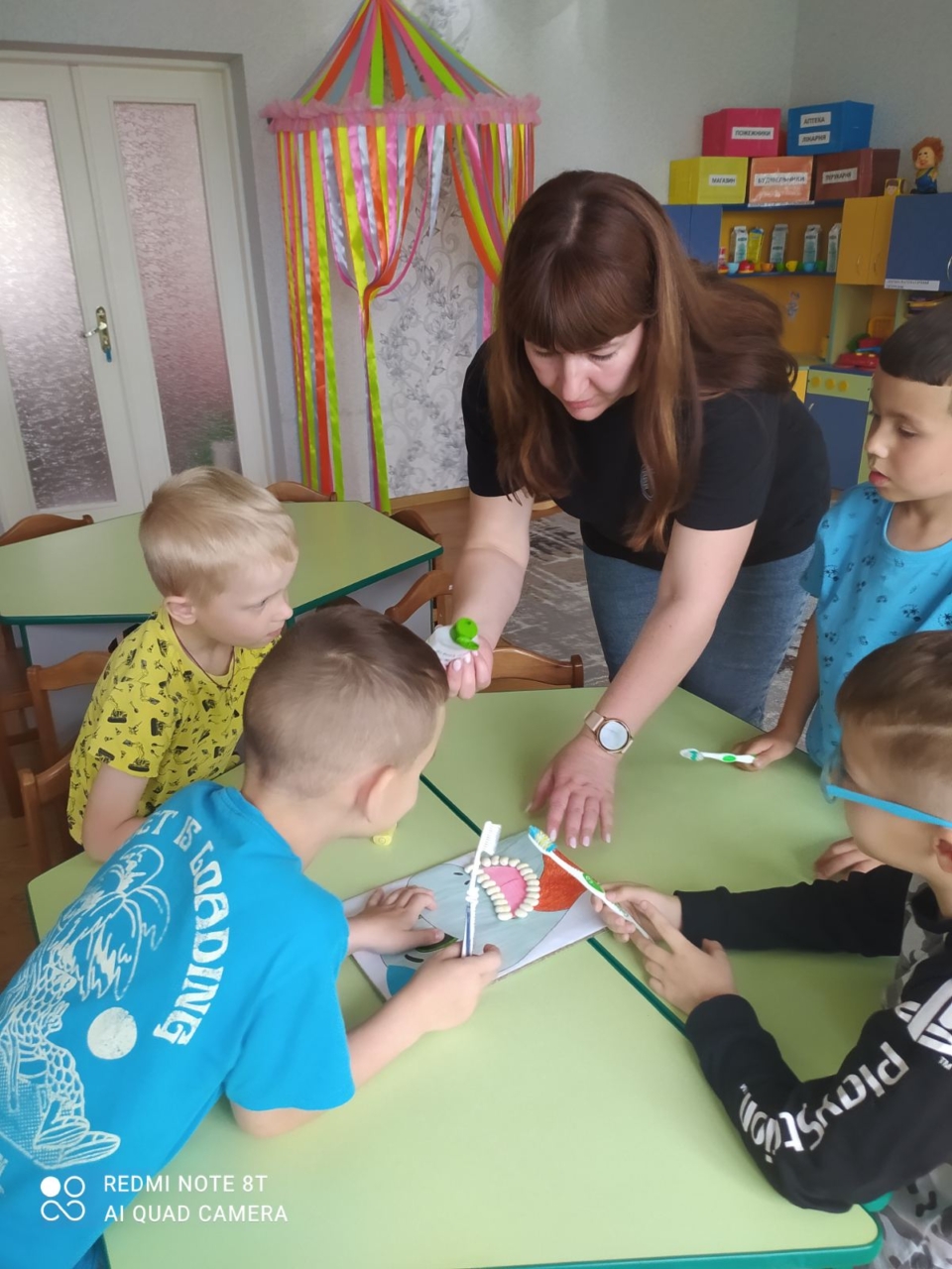 Під час зустрічі дітям розповіли про правильну методику чищення зубів, особисту гігієну та правила догляду за ротовою порожниною. У вигляді гри практикували “вимітаючі” рухи при чищенні зубів та язика.