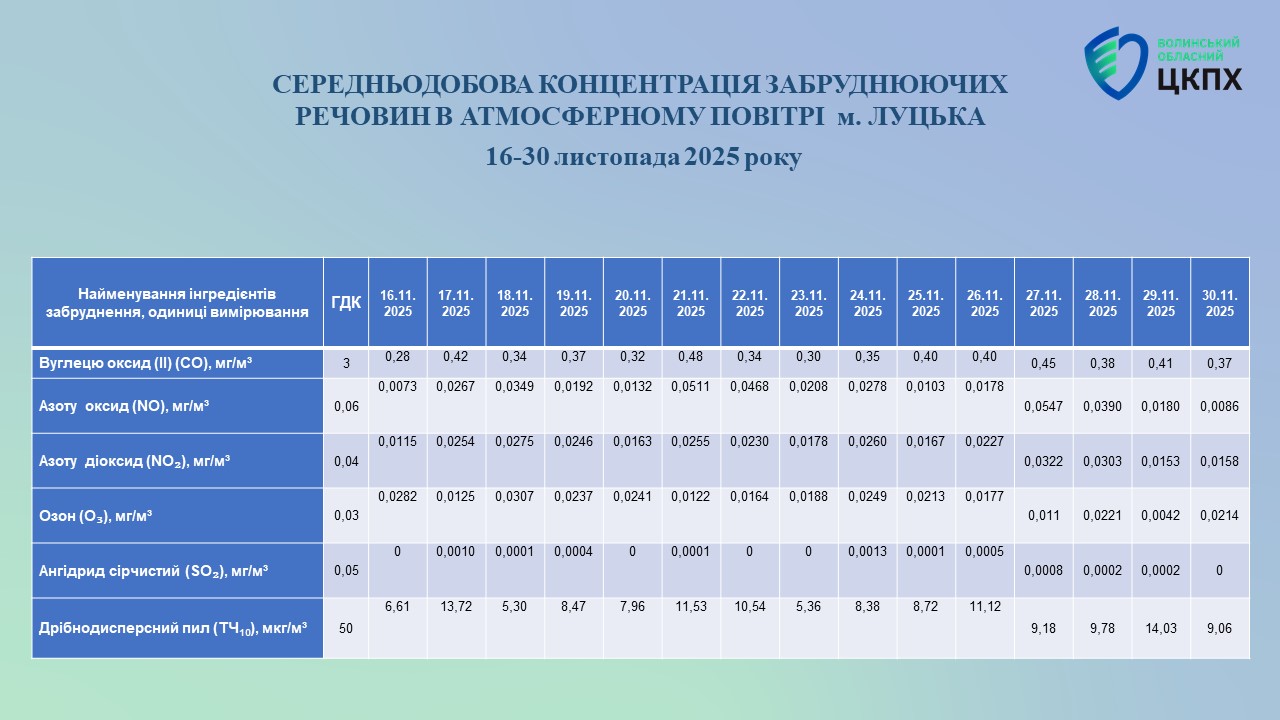 Середньодобова концентрація забруднюючих речовин в атмосферному повітрі з 16-30 листопада 2025 р.