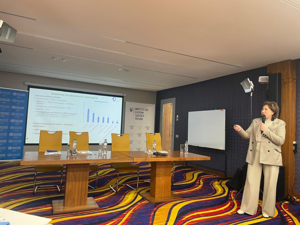 Наталія Янко, зокрема, поділилася з учасниками заходу досвідом Центру щодо епідеміологічного нагляду за лістеріозом у Волинській області. Вона наголосила, що лістеріоз – це класичний приклад захворювання, де має бути застосований підхід “One Health” – єдине здоров’я людини, тварин та довкілля. Потрібно створити єдину інформаційну базу, щоб систематизувати інформацію про: випадки лістеріозу у сільськогосподарських тварин у господарствах області, результати досліджень харчових продуктів на наявність L. Monocytogenes та населені пункти з підвищеним ризиком.