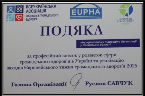 Волинський осередок Всеукраїнської асоціації фахівців з громадського здоров’я, який очолює Наталія Янко, отримав Подяку за професійний внесок у розвиток сфери громадського здоров’я в Україні та реалізацію заходів Європейського тижня громадського здоров’я 2025.