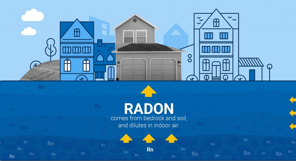 Джерелами радону є гірські породи та ґрунти. У приміщення він також може проникати зі стін і фундаменту будівель (якщо будівельні матеріали не відповідають вимогам), із водопровідною водою, особливо якщо вона надходить з артезіанських свердловин. Опромінення від радону у воді призначеній для пиття, є незначним порівняно з опроміненням від інгаляційного надходження радону із повітрям приміщень.